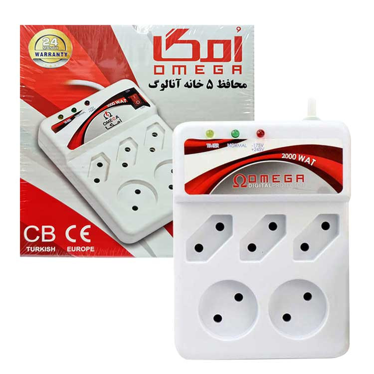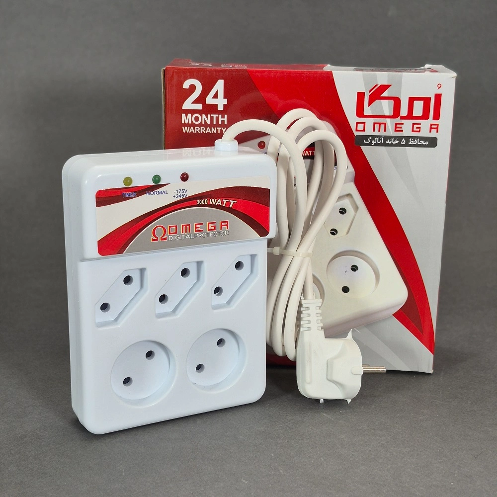 محافظ برق 5 خانه امگا (Omega) با طول کابل 1/5 متر صرفا برای کامپیوتر طراحی شده است. این محصول دارای سه خانه برای دو شاخه های تخت و همچنین دارای دو خانه برای دو شاخه های سر گرد است. حداکثر جریان انتقالی این محافظ 10 آمپر است و حداکثر ولتاژ برای قطع شدن جریان آن بین 240 تا 245 ولت متغیر است.
