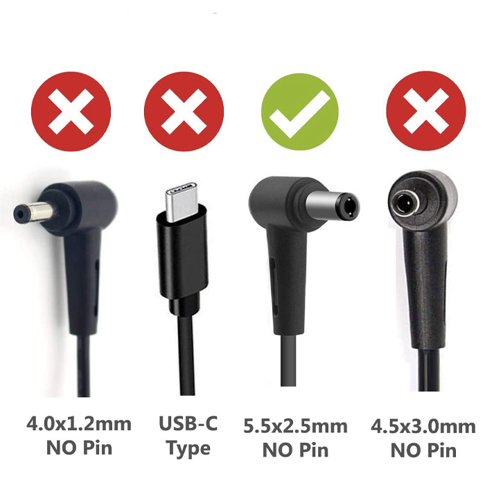 حتماً اطمینان حاصل کنید که ولتاژ خروجی آداپتور (19V) دقیقاً با نیاز لپتاپ شما مطابقت دارد. استفاده از ولتاژ بالاتر یا کمتر ممکن است دستگاه را آسیب بزند
