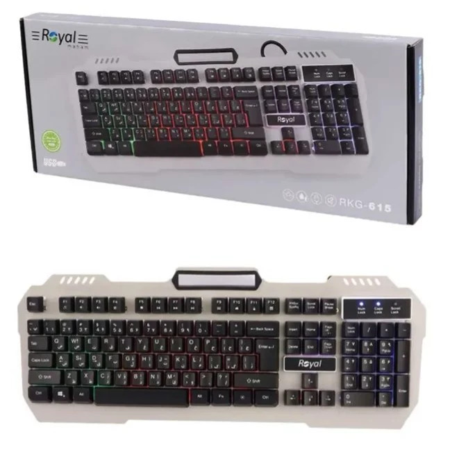 معرفی کیبورد باسیم گیمینگ Royal-K615 مدل : RKG-615 نوع کاربری : خانگی / اداری / گیمینگ نوع اتصال : با سیم نوع رابط : USB طول کابل : 1٫4 متر تعداد کلید ها : 104 عدد نورپردازی RGB : دارد جنس بدنه : پلاستیک و فلز قابلیت ها : پایه های قابل تنظیم / طراحی ارگونومیک / مقاوم در برابر فشار و ضربه / عملکرد کم صدا سازگار با سیستم عاملهای : تمامی سیستم عامل های ویندوز / MacOS